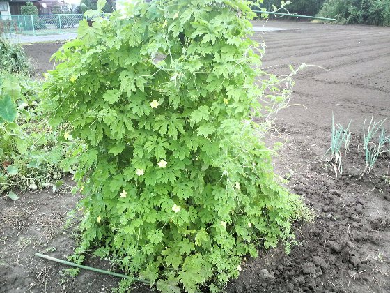 支柱を4本立ててそこに4本のゴーヤを植えた