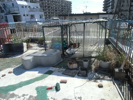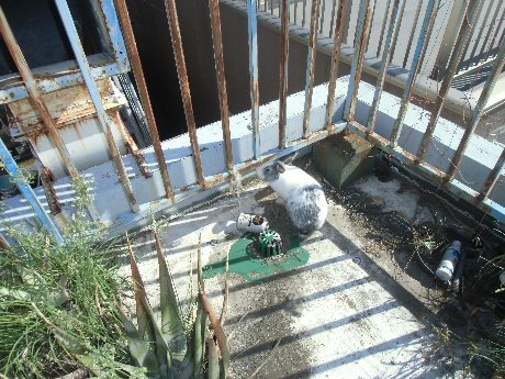 でも胴輪は嫌がる 4年も飼っているとだいぶでかい つけるのも大変 そこで屋上ならいいかな 置いてしばらくしたら見に来ようと思ったが 飼い主同様 思いつきで行動する 間違って転落とも考えられる 今日はウサギが降ってきましたでは洒落にもならない 仕方ない付き合うか まださえぎるものが無いこともあり暑いので 10分足らずのはじめての屋上散歩でした この後毛繕い ケージの前に置いたらいつものように自分で入って行った