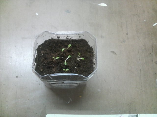 ペットボトルを切って土を入れ発芽したレタスを植えた。